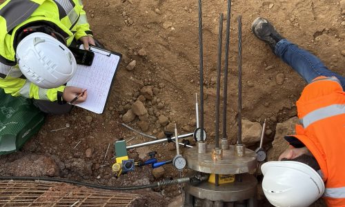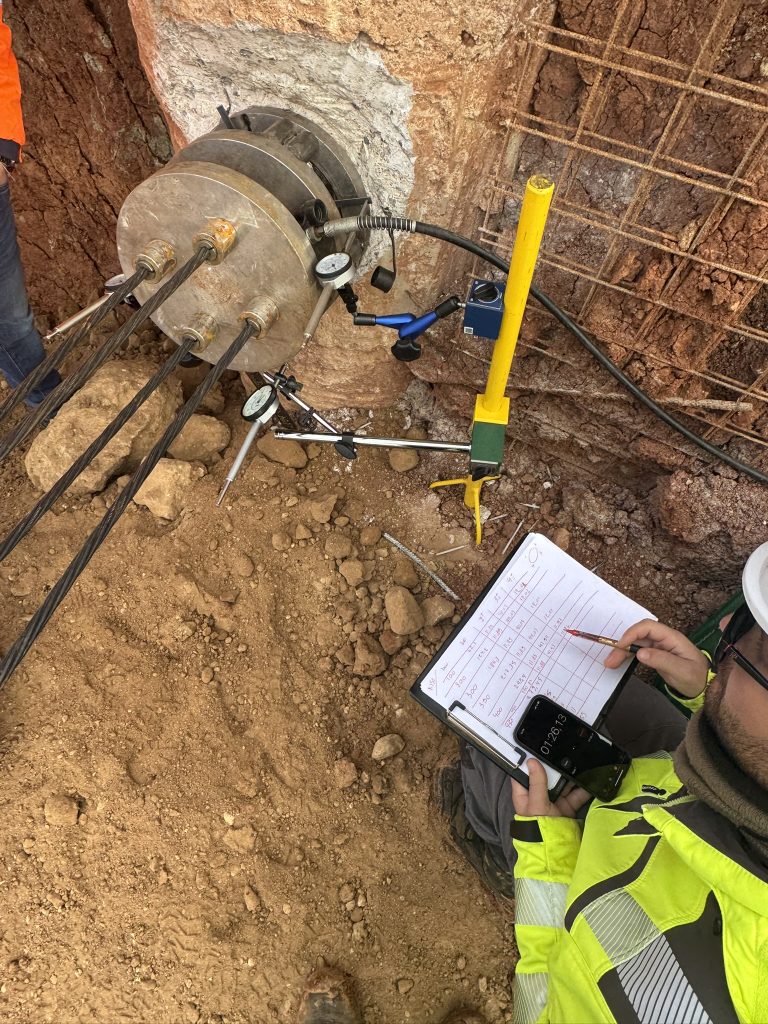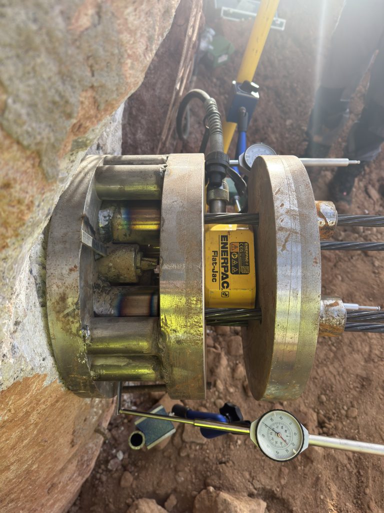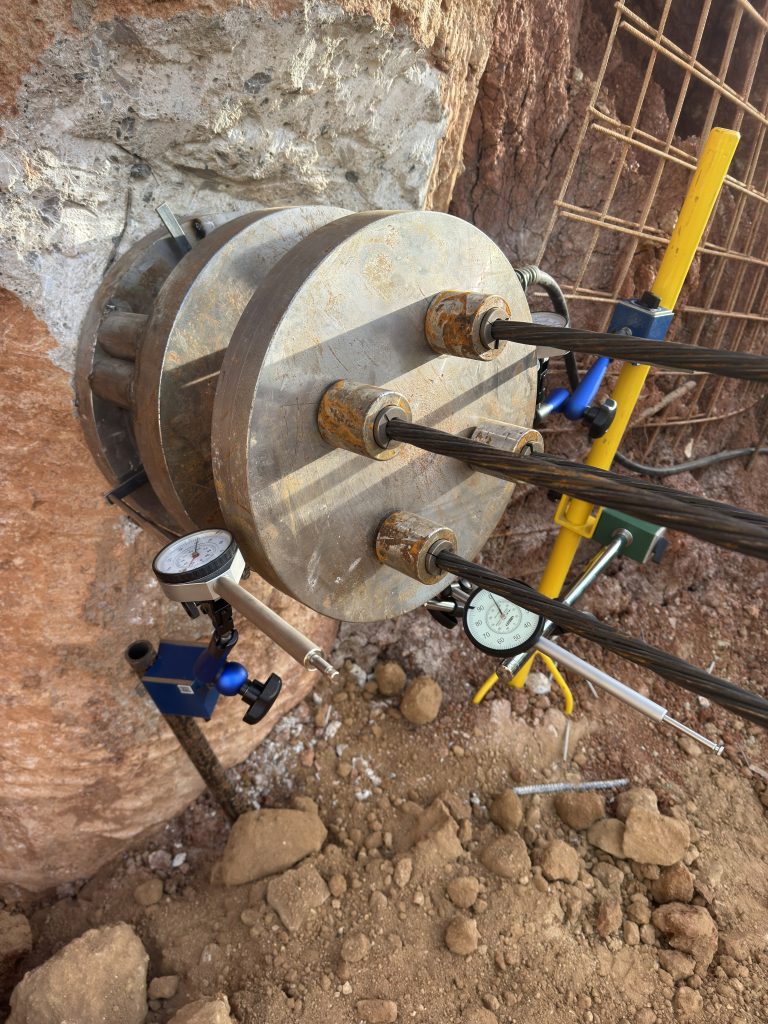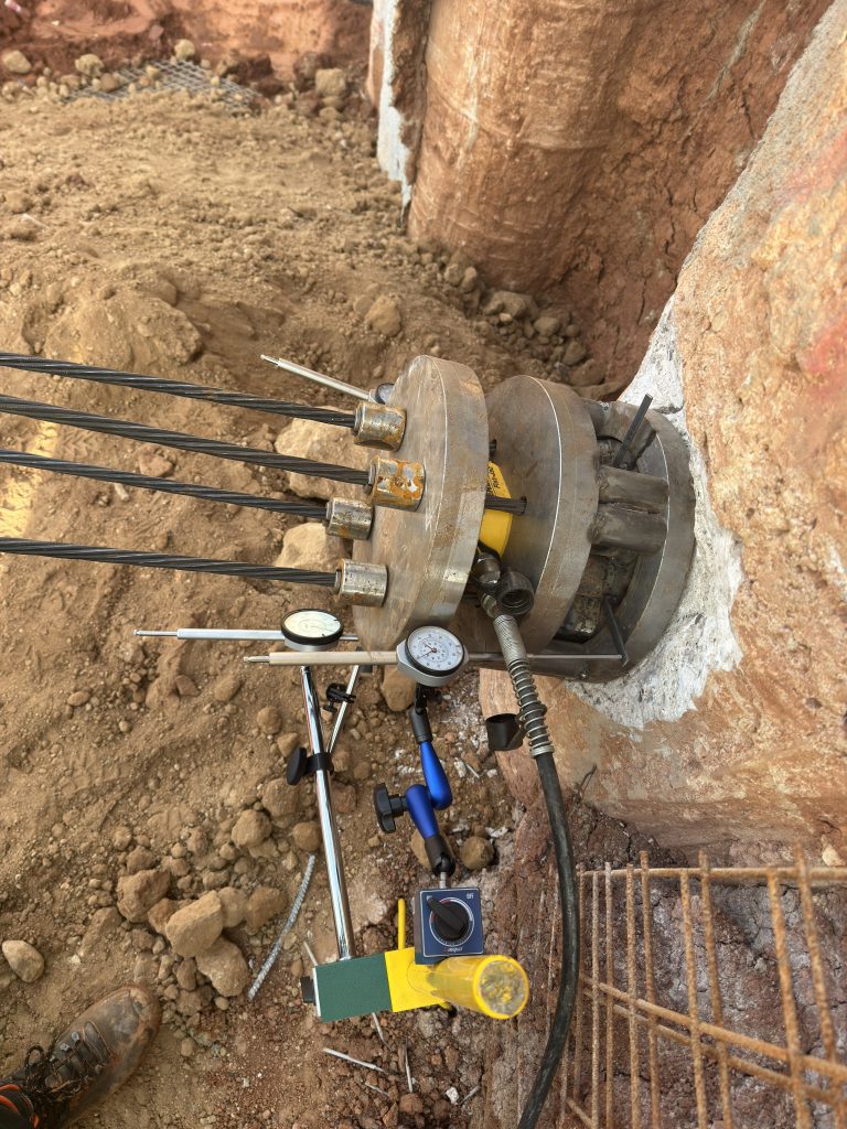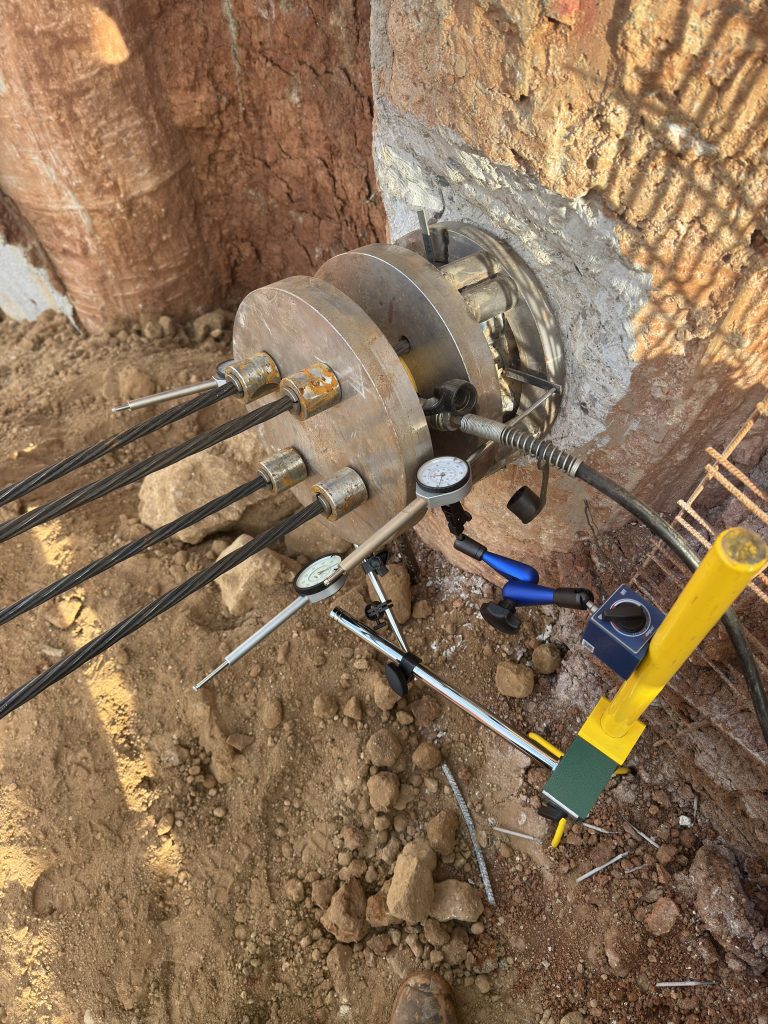 HiSCS designed, procured, fabricated, and implemented a customized testing configuration for the assessment of existing temporary ground anchors. Our team installed a system of supplementary stressing plates, connected with high‑strength strands, and secured using additional barrels and wedges. A single‑acting, low‑profile hydraulic jack with a hand pump was positioned between the plates to operate as a proof‑load indicator. Detailed measurements were recorded throughout the stressing procedure, enabling accurate evaluation of the in‑service (operational) stressing force. Overall, the applied testing configuration facilitated a precise and comprehensive assessment of the anchors’ operational load‑bearing behavior.